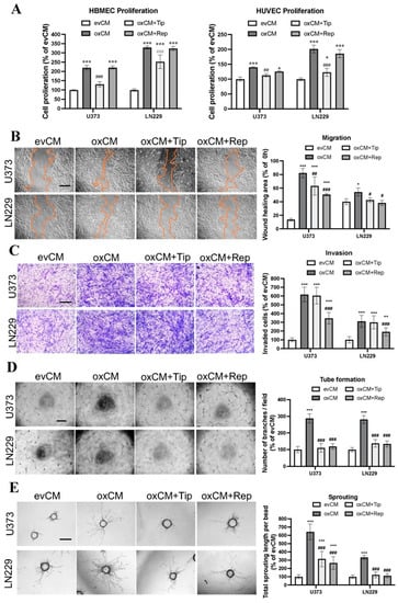 For indirect co-culture, EC proliferation was detected by MTT assay (cat# M6494; Invitrogen, Darmstadt, Germany) as previously described [22]. Briefly, HBMECs and HU-VECs (4000 cells/well in a 96-well plate) were incubated in evCM/oxCM without or with inhibitors or vehicle DMSO. MTT assay was performed 48 h after incubation.
