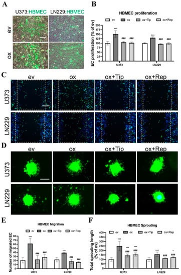 Next, we studied the EC angiogenic phenotype in direct co-culture, which allows direct interaction of GBM cells with ECs, mimicking an in vivo tumor environment. To distinguish HBMECs from co-cultured GBM cells, CFSE, a long-retaining green fluorescence tracker for living cells, was used to label HBMECs prior to direct co-culture. Figure 3A shows CFSE-labeled HBMECs (green) directly co-cultured with transduced U373 or with LN229 cells in a ratio of 1:1. The angiogenic phenotype of HBMEC, including proliferation, migration, and sprouting, was investigated under this established direct co-culture condition. As presented in Figure 3B, HBMECs grew more rapidly when directly co-cultured with oxU373 and oxLN229 cells than with corresponding evGBMs (151.5% and 130.6%, respectively, for U373 and LN229; p < 0.001). Of note, this proliferative effect was completely reversed by the treatment with tiplaxtinin and reparixin (p < 0.001). The images acquired 12 h after scratching revealed more migrated HBMECs (green) when directly co-cultured with oxU373 and oxLN229 (Figure 3C). A remarkable increase in HBMEC sprouting appeared after 24 h of direct co-culture with oxU373 and oxLN229 (Figure 3D). Quantitative analysis of the migration images demonstrated a 6-fold (p < 0.001) and 4-fold (p < 0.001) increase in migrated HBMECs when co-cultured with oxU373 and oxLN229, respectively, which was entirely suppressed by the treatment of both inhibitors (Figure 3E). Analysis of the length of EC sprouts indicated 2.5-fold (p < 0.001) and 1.5-fold (p < 0.001) longer sprouts in HBMECs co-cultured with oxU373 or with oxLN229, respectively, and this effect was restored to the basal level in the corresponding evGBM groups in the presence of the respective inhibitors tiplaxtinin and reparixin (Figure 3F). These findings are consistence with that observed in indirect co-culture, indicating a potent pro-angiogenic role of ALDH1A3 via PAI-1 and IL-8.