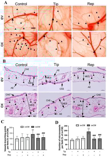 To validate our in vitro findings, we employed an in vivo angiogenesis model in chicken CAM. Figure 4A shows representative images of the vasculature on CAM 3 d after treatment with media derived from transduced U373 cells. Along with the stem (big) vessel (arrow), a denser and higher-branched microvessel network (arrowheads) was visualized in the ox group compared to that in the ev group. This hyper-angiogenic phenotype was attenuated in the presence of the inhibitors tiplaxtinin or reparixin. Further histological studies were performed on CAM sections. H&E staining revealed the histological and vascular features of the CAM (Figure 4B). We observed a higher microvessel density in the ox group than that in the ev group, which was reduced in the presence of individual inhibitors in the treatment media. Interestingly, a much thicker mesenchymal (MES) layer was observed on the section from ox media-incubated CAM. This may be a result of the proliferation of mesenchymal cells and microvessels. Figure 4C and Figure 4D, respectively, show the quantitative analysis of the branching points (based on CAM images in Figure 4A) and the number of microvessels (based on histological sections in Figure 4B). 150% of the increase in vessel branching point (Figure 4C, p < 0.001) and 189% of the higher microvessel density (Figure 4D, p < 0.001) were found in the ox group compared with the corresponding ev group. This increase in both parameters of angiogenesis was completely diminished by the treatment of the individual inhibitors of PAI-1 and IL-8 receptors (both p < 0.001), whereas the basal level of vascular branching point and number of microvessels in the corresponding ev group was not affected by inhibitors (Figure 4C,D). These in vivo findings strongly supported the data from our in vitro study.