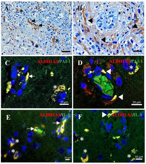Immunohistochemistry and immunofluorescence staining on GBM sections. (A,B) Immunohistochemistry staining of ALDH1A3. The immunoreactivity of ALDH1A3 was detected in vessels (arrows in (A)) and peripheral cells of glomeruloid (arrowheads in (B)) as well as in tumor cells (asterisks in (A)). Scale bar: 50 µm in (A) and 20 µm in (B). (C–E) Double-immunofluorescence staining of ALDH1A3 (red) with PAI-1 (green) (C,D) or with IL-8 (green) (E,F). The co-localization of ALDH1A3 with PAI-1 or with IL-8 immunoreactivity was detected in microvessels (arrows), glomeruloid (arrowheads), and tumor cells (asterisks) in GBM sections.