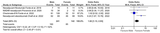 To answer this question, we used data from three single arm phase II trials and 1 randomized phase III trial that met our eligibility criteria, i.e., to generate results of MPR based on sex. The heterogenicity of MPR was not significant (p = 0.1; I2 = 52%), meaning that the fixed effects model was used. The MPR OR comparing males and females was 1.82 (95% CI 1.13–2.93; p = 0.01), which was statistically significant and favored the female subgroup (Figure 1). A second analysis was performed using the studies that reported pCR based on sex, which included three phase II trials (two single arm and one randomized) and one phase III trial. The heterogenicity of pCR was significant (p = 0.75; I2 = 0%), meaning that the random effects model was used. The pCR OR comparing males and females was 1.62 (95% CI 0.97–2.75; p = 0.08), which was not statistically significant, although there is a tendency to favor the female subgroup (Figure 2).