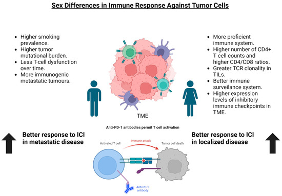Despite their being scarce literature addressing sex-based difference response to ICIs, some differences have been reported. Hormones can change the function and expression of PD-1 and mediate autoimmunity [52,53]. Furthermore, in pre-clinical melanoma murine models, the different efficacy of anti-PD-L1 in relation to the sex has been described [54]. In this sense, Conforti et al. [55] hypothesize that male patients could have a better benefit from ICI in metastatic disease than female patients due to three considerations: (1) There is sex dimorphism in immunity. Tumors in woman tend to have a better immune surveillance system and need a stronger immune-editing process to produce metastases [55]. This process could make the tumors less immunogenic and have more mechanisms to evade the immune system. This issue would make the tumor more resistant to immunotherapy [56]. (2) The tumor mutational burden is significantly higher in male patients, irrespective of other factors [57]. Finally, (3) there is a lower smoking prevalence in female than male populations, which affects the tumor mutational burden stemming from this behavior [58].