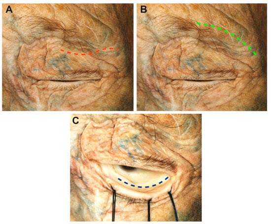 Summary of the different skin incisions: (A) transpapebral (red dotted line), (B) supraorbital transciliary (green dotted line), (C) inferior eyelid conjunctival incision (blue dotted line).