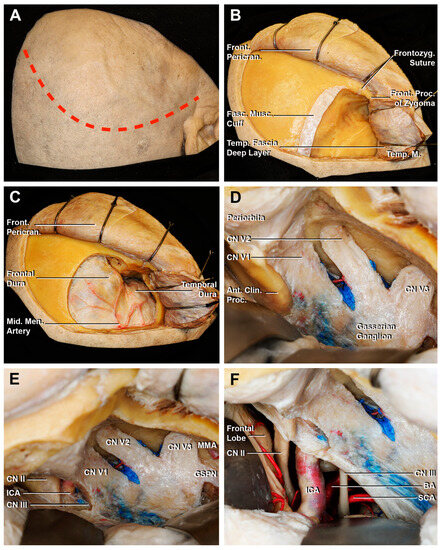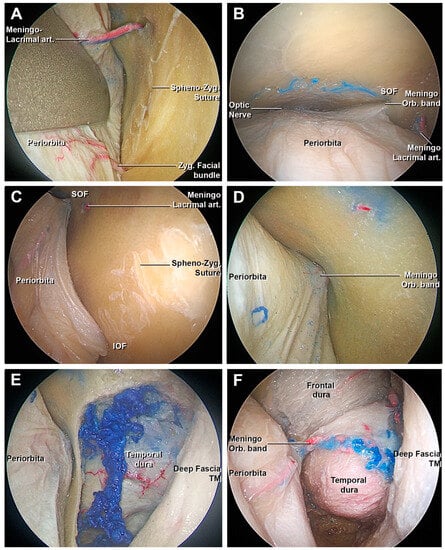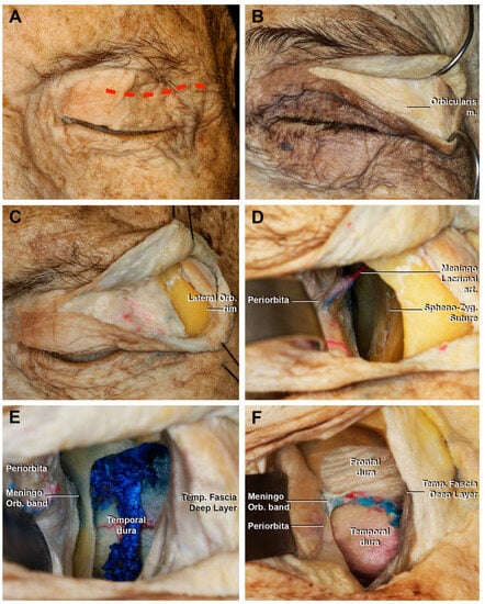 Macroscopical view of the superior eyelid transorbital endoscopic with the removal of the lateral orbital rim. (A) Skin incision (red dotted line); (B) detail of fibers that form the palpebral portion of the orbicularis muscle; (C) incision of the orbicularis muscle and exposure of the lateral orbital rim. (D) Sub-periorbital dissection. The sphenozygomatic suture and the meningo-lacrimal artery are exposed. (E) After the craniectomy and, in this case, the removal of the lateral orbital rim, the temporal dura and the temporal muscle are exposed; (F) extension of the craniectomy superiorly, with the identification of the frontal dura mater. The meningo-orbital band, which connects the periorbita with the fronto-temporal dura, is shown. Lateral Orb. rim, lateral orbital rim; Meningo Lacrimal art., meningo lacrimal artery; Meningo Orb. band, meningo-orbital Band; Temp. Fascia Deep Layer, temporal fascia deep layer.