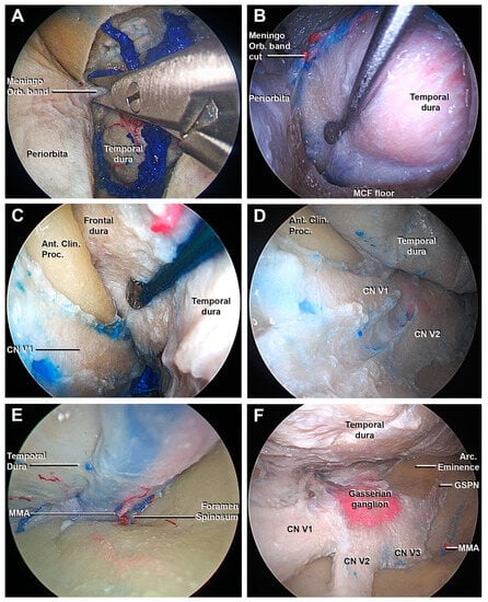 Endoscopic perspective of the superior eyelid transorbital endoscopic after the craniectomy: endocranial step. (A) The cutting of the meningo-orbital band using a microscissor is performed. (B–D) The interdural dissection between the meningeal layer of the lateral wall of the cavernous sinus and the temporal dura is obtained using a surgical route from lateral to medial: the lateral surface of anterior clinoid process and the cavernous sinus are shown. (E) The middle meningeal artery is found at the level of the foramen spinosum; after the cutting, the extradural peeling of the middle skull base is completed. (F) Final view of the middle cranial fossa: the gasserian ganglion, the three branches (V1, V2, and V3) of the trigeminal nerve, and the GSPN are identified. Ant. Clin. Proc., anterior clinoid process; Arc. Eminence, arcuate eminence; GSPN, greater superficial petrosal nerve; MMA, middle meningeal artery; MCF, middle cranial fossa; Meningo-Orbital band, meningo-orbital band; V1, ophthalmic division of CN V; V2, maxillary division of CN V; V3, mandibular division of CN V.