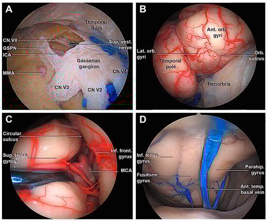 - Guizzardi, G.; Mosteiro, A.; Hoyos, J.; Ferres, A.; Topczewski, T.; Reyes, L.; Alobid, I.; Matas, J.; Cavallo, L.M.; Cappabianca, P.; et al. Endoscopic Transorbital Approach to the Middle Fossa: Qualitative and Quantitative Anatomic Study. Oper. Neurosurg. 2022, 23, e267–e275. [Google Scholar] [CrossRef]