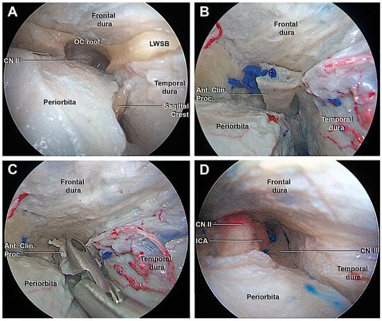 Endoscopic view of the transorbital extradural anterior clinoidectomy. (A) After the drilling of the orbital surface of the body of the zygomatic bone and the greater sphenoid wing, the optic roof, optic strut, and the lesser sphenoid wing anchor the anterior clinoid process. The roof of the orbital canal is opened to expose the CN II. (B) The interdural dissection of the lateral wall of the cavernous sinus allows to detach the anterior clinoid process from the surrounding dura and facilitate its removal. (C) Removal of the ACP. (D) Final view after the transorbital extradural anterior clinoidectomy. From medial to lateral: the optic nerve, ICA, and third cranial nerve, which are delimited superiorly by the frontal dura, laterally by the temporal dura. Ant. Clin. Proc., anterior clinoid process; CN II, optic nerve, CN III, oculomotor nerve; ICA, internal carotid artery; LWSB, lesser wing sphenoid bone.