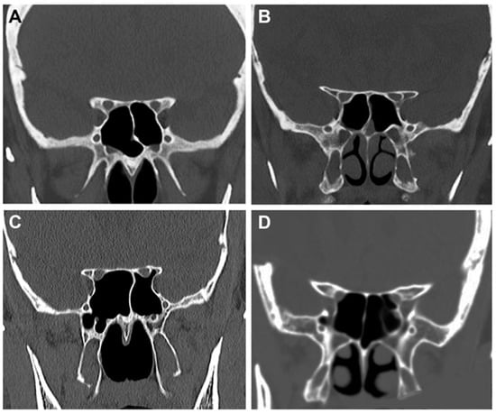 Coronal sections of the 4 variants of the optic nerve identified in the 200 CT scans according to DeLano’s classification [48]. (A) Type 1: the optic canal is located laterally to the sphenoid sinus, without any impression. (B) Type 2: the right optic canal is characterized by an impression on the lateral wall of the sphenoid sinus. (C) Type 3: both optic canals run into the sphenoid sinus. (D) Type 4: the right optic canal is characterized by the presence of Onodi cell or spheno-ethmoidal air cell.