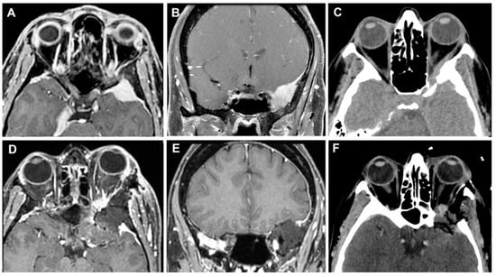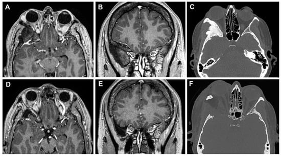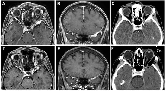 The postoperative course was uncomplicated. Histological analysis confirmed the diagnosis of the sphenoid wing and intraosseous meningioma (WHO grade 1). Five years after surgery, no evidence of bone regrowth or tumor was documented (Figure 10D–F).