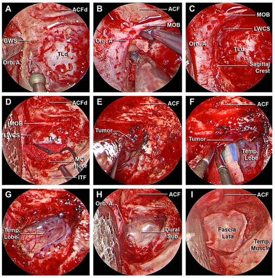Main steps of the removal of the temporo-polar meningioma. (A–C) Drilling of the left greater sphenoid wing followed by the exposure of the meningo-orbital band, orbital apex, and the dura mater of the temporal lobe. (D–F) After opening of the latero-inferior portion of dura mater, the meningioma was progressively dissected from the surface of the temporal lobe. (G) Complete excision of the lesion and exposure of the temporal lobe, with the preservation of the arachnoid plane. (H,I) Accurate hemostasis and plane closure with adipose tissue and fascia lata. ACF, anterior cranial fossa; ACFd, anterior cranial fossa dura; Dural Sub., dural substitute; GWS, greater wing of the sphenoid bone; ITF, infratemporal fossa; LWCS, lateral wall of the cavernous sinus; MCF floor, middle cranial fossa floor; MOB, meningo-orbital band; Orb. A., orbital apex; Temp. Lobe, temporal lobe; Temp. Muscle, temporal muscle; TLd, temporal lobe dura.
