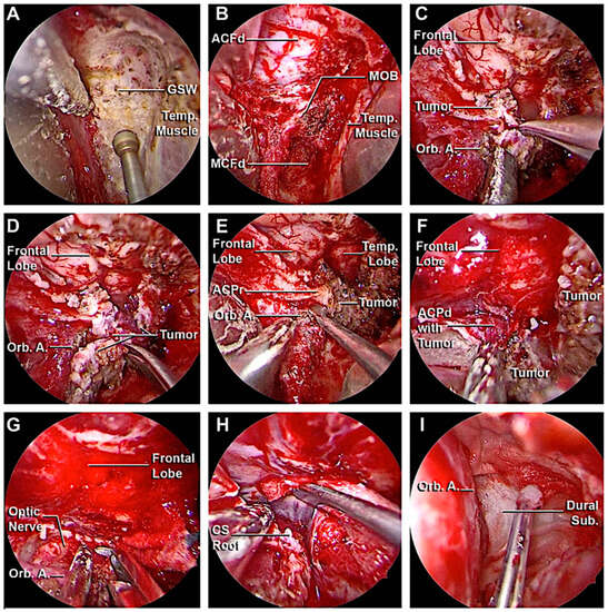 Main steps of the removal of the sphenoid wing meningioma. (A,B) Drilling of the left greater sphenoid wing with the exposure of the meningo-orbital band and the fronto-temporal dura. (C,D) Complete removal of the intradural portion of the lesion. (E–H) Anterior clinoidectomy, with the exposure of the optic nerve and cavernous sinus roof. (I) Final hemostasis and closure. ACF, anterior cranial fossa; ACFd, anterior cranial fossa dura; ACPd, anterior clinoid process dura; ACPr, anterior clinoid process root; CS Roof, cavernous sinus roof; Dural Sub., dural substitute; GWS, greater wing of the sphenoid bone; ITF, infratemporal fossa; LWCS, lateral wall of the cavernous sinus; MCF floor, middle cranial fossa floor; MCFd, middle cranial fossa dura; MOB, meningo-orbital band; Orb. A. orbital apex; Temp. Lobe, temporal lobe; Temp. Muscle, temporal muscle.