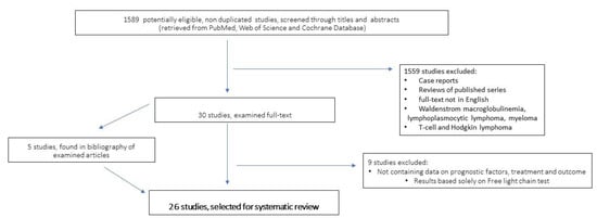 A total of 1589 studies were examined for titles and abstracts; 1559 studies were excluded, based on the inclusion and exclusion criteria (Figure 1). Finally, 30 papers were examined as full-text, and 9 of these were excluded due to: (1) lack of essential information, or (2) the assessment of monoclonal paraprotein was carried out only by the FLC assay. Furthermore, 5 more articles were found in the bibliography of retrieved articles. Overall, 26 articles were selected and thoroughly analyzed for this systematic review.