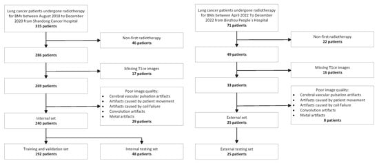 Approval to carry out this study was received from the institutional review board, and the identification information of the enrolled patients was anonymized; the requirement to obtain written informed consent was waived due to the retrospective nature of the study. In all, 335 lung cancer patients who underwent radiotherapy for BMs at Shandong Cancer Hospital and Institute from August 2018 to December 2020 were enrolled, along with 71 lung cancer patients who underwent radiotherapy for BMs at Binzhou People’s Hospital from April 2022 to December 2022. As shown in Figure 1, after patient exclusion, a total of 240 and 25 patients were finally included in the internal set and external set, respectively. All patients in the internal set were imaged using a GE Discovery MR 750W scanner with six channels of head coils in the same posture. The patients in the external set were all imaged using a Siemens Magentom Avanto scanner.