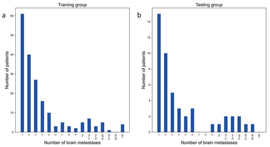 All these patients had complete single-sequence T1-weighted contrast-enhanced (T1ce). The MRI images were manually annotated by two oncologists with five and six years of experience, respectively, utilizing MIM Maestro 6.8.2 software. Each oncologist annotated all images, while another oncologist with sixteen years of experience modified the mask if necessary and confirmed any inconsistent areas. There were a total of 1030 BMs in the internal dataset, for average of 4.3 BMs per patient. The external set included 130 BMs, for an average of 5.2 BMs per patient. The patients in internal set were randomly divided into a training group and a testing group at a ratio of 8:2 (192:48). To make the SA-YOLOv5 framework focus on the characteristics of BM regions, the slices of patients without BM regions were eliminated in the training group, preserving 2269 images. These preserved images were divided into a training set and a validation set at a ratio of 8:2. The validation set was used to verify the model’s performance and save the best weights of the DL method. The internal testing set used for model evaluation consisted of whole MRI images from the 48 patients in the testing group. The respective distributions of BMs in the training group and internal testing set are shown in Figure 2.
