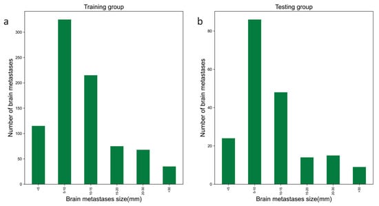 The distribution of BM maximum diameters in the training group and internal testing set: (a) distribution of BM maximum diameters in the training group and (b) distribution of BM maximum diameters in the internal testing set.
