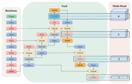 As shown in Figure 4, a path aggregation network (PAN) [24] structure is added to the neck in combination with the feature pyramid network (FPN) [25] structure to form a powerful feature fusion layer in the neck. Furthermore, a convolutional block attention module (CBAM) [20] is added to the neck to capture important information on small BMs. The CBAM contains a Channel Attention Module (CAM) and a Spatial Attention Module (SAM), which can be mathematically expressed as