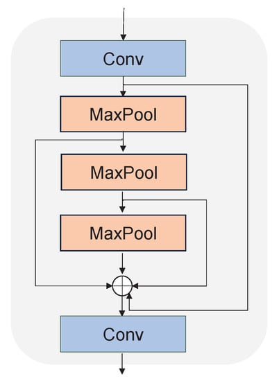 The backbone consists of a Focus block, Conv block, C3 block, and SPPF block. The Focus block is implemented using a convolutional block, while the Conv block is composed of a convolutional block, batch normalization unit, and SiLU. As shown in Figure 5, the C3 block is constructed via two residual structures composed of several convolutional blocks. The Conv1 block is composed of a convolutional block, batch normalization unit, and SiLU, while the Conv3 block is composed of a convolutional block, batch normalization unit, and SiLU. Furthermore, the SPPF block, shown in Figure 6, consists of the Conv block and MaxPool layers. The feature maps output by the MaxPool layers are concatenated together and then reshaped by the Conv block.