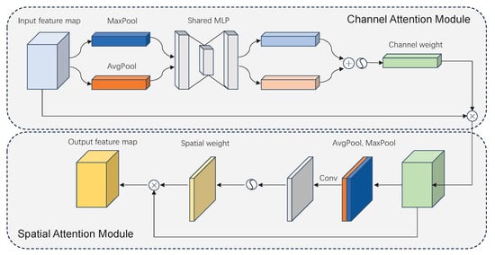 where and respectively represent the feature maps of the channel attention map and spatial attention map, is the sigmoid function, and respectively represent the global average pooling and global max pooling, F denotes the input feature map, denotes multi layer perceptron, and denotes the convolutional block with a filter size of .