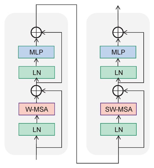 Unlike the common multi-head self attention module, the STB is formed based on the concept of shifted windows [26]. As shown in Figure 8, two consecutive blocks are in a string connection, with each block is composed of a multilayer perceptron (MLP) with a SiLU, LayerNorm (LN) layer, and multi-head self attention module. The windows multi-head self-attention (W-MSA) module and shifted windows multi-head self-attention (SW-MSA) module are respectively contained in these two blocks. The STB employs W-MSA and SW-MSA to change the regular window partitioning method, instead using the more efficient shifted window partitioning strategy shown in Figure 9. Not only does this maintain efficient computation of non-overlapping windows, it establishes connections between different windows. In the W-MSA module, the feature map is divided into windows and the self-attention operation is performed within each window. The purpose of the SW-MSA module is to realize information exchange between different windows. The attention window shifts between different attention heads, meaning that each attention head focuses on a different window, thereby increasing the diversity of features. The STB can be mathematically expressed as follows: