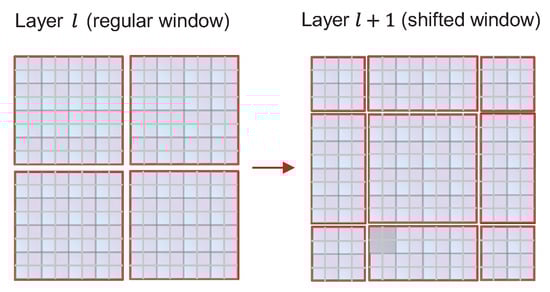 Windows used for self-attention computations in the adjacent layers l and l plus one are divided into a regular window and shifted window.