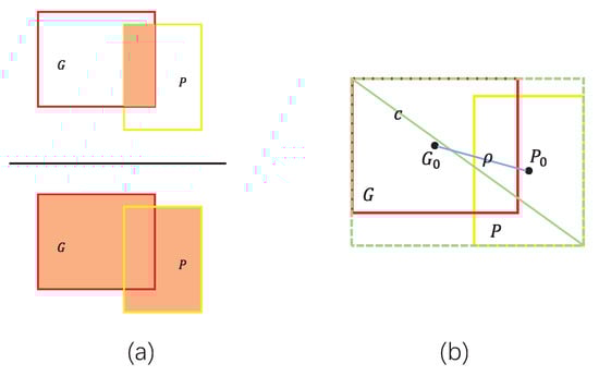 The most common method for punishing imprecise prediction bounding boxes is to employ the Intersection over Union () loss function [27] or its improved variant. As shown in Figure 10a, the is used to quantify the ratio of the intersection and concatenation of prediction bounding box (P) and ground truth bounding box (G). The and can be expressed as follows: