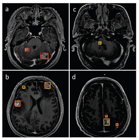The representative testing images in Figure 11 and Figure 12 show true positive, false positive, and false negative inferences from the proposed model. The red bounding boxes represent the ground truth, while the yellow bounding boxes represent the model prediction results. As shown in Figure 11 and Figure 12, the proposed SA-YOLOv5 model can detect almost all BMs with regular volumes. However, blood vessels and calcification in MRI images can cause interference during the BM detection process, resulting in false negative and false positive results.