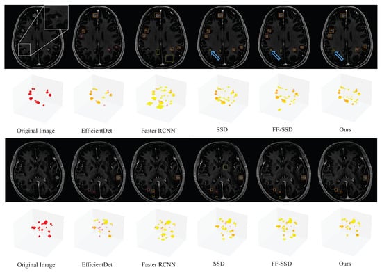 To more intuitively compare the performance of the different detection models, Figure 13 displays the ground truth and prediction results on the original MRI images of two distinct patients. The predicted results of these two patients are visualized in 2D and 3D, respectively. The red bounding boxes represent the ground truth, while the yellow bounding boxes represent the model prediction results. Notably, EfficientDet [37] and Faster R-CNN [36] do not perform well in detecting BMs. EfficientDet [37] generates fewer prediction bounding boxes, resulting in many undetected lesions. Conversely, Faster R-CNN identifies many vascular regions as BMs, leading to a high number of false positive results. Compared with EfficientDet [37] and Faster RCNN [36], SSD [9], FF-SSD [11], and our proposed model all demonstrate superior detection performance. In particular, our proposed model successfully detects all the BMs distributed in the original images, with arrows indicating possible lesions around the yellow bounding box. A magnified view of this region is visible in the upper right corner of the original image. When re-examined by two oncologists and one physicist, this was revealed to be an undiscovered BM with similar characteristics to those of blood vessels. Compared to other models, SA-YOLOv5 does not misidentify so many vascular regions as BMs, and shows accurate identification ability.