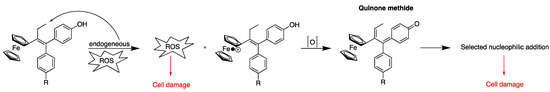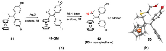 - Wang, Y.; Richard, M.-A.; Top, S.; Dansette, P.M.; Pigeon, P.; Vessières, A.; Mansuy, D.; Jaouen, G. Ferrocenyl Quinone Methide-Thiol Adducts as New Antiproliferative Agents: Synthesis, Metabolic Formation from Ferrociphenols, and Oxidative Transformation. Angew. Chem. Int. Ed. 2016, 55, 10431–10434. [Google Scholar] [CrossRef]