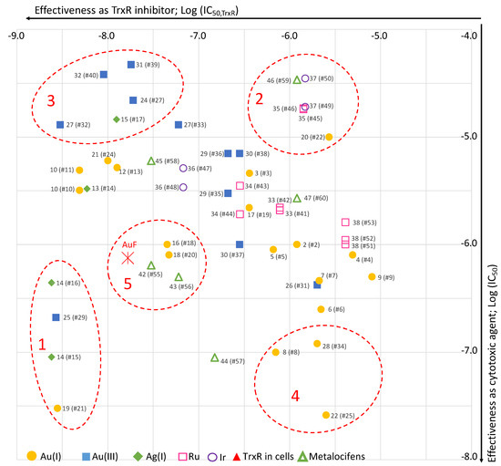 Among the abundance of literature, we chose to focus on a selection of 45 organometallic complexes that we consider as representative of the state of the art in the field. Our goal is to establish a possible correlation between the ability of the complexes to inhibit TrxR (in its isolated form, in cells or even in tumor) and their effects on cancer cell viability. These molecules are represented in Chart 2 and Chart 3; their IC50 on isolated TrxR (or cellular TrxR) and their cytotoxicity are gathered in the following tables. The first group (Table 1) includes the linear NHC-gold(I) and silver(I) complexes having as second ligand L a second NHC, a thiolate or a chlorido ligand. The second group (Table 2) comprises other organometallic gold(I) complexes and gold(III) complexes. The third group (Table 3) comprises organometallic complexes of other transition metals. Finally, the fourth group consists of a selection of metallocifens (see table in Section 5).