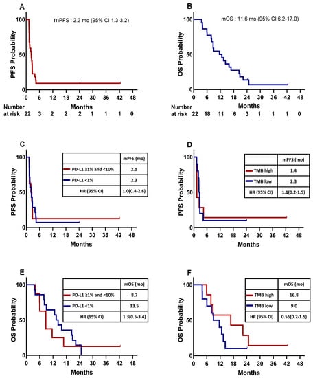 Kaplan–Meier plot for the median progression-free survival (mPFS) and median overall survival (mOS) calculated from the date of the beginning of enrollment. (A) mPFS for the entire study population. (B) mOS for the entire study population. mPFS of patients stratified by PD-L1 expression (C) and tumor mutation burden (TMB) (D). mOS of patients stratified by PD-L1 expression (E), TMB (F). HR, hazard ration; CI, confidence interval; mo, month; PFS; OS.