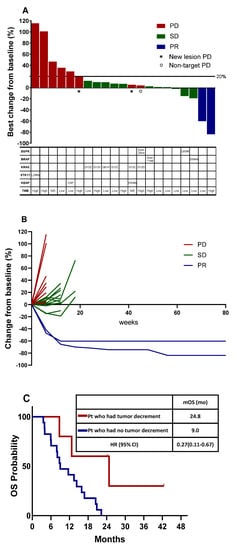 The tumor burden dynamics during treatment are shown in a spider plot (Figure 2B). Two patients with PR remained responsive even after discontinuation of treatment. The tumor burden decreased in five patients (22.7%). Five patients with decreased tumor burden had longer OS (24.8 months [95% CI, 5.9–43.7]) compared to those who only had an increment of tumor burden (9.0 months [95% CI, 4.3–13.7]) (p = 0.016) (Figure 2C).