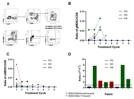 MDSCs have phenotypes similar to immature myeloid cells, which differentiate into dendritic cells, macrophages, and granulocytes. However, MDSCs can accumulate abnormally in the blood under chronic inflammatory conditions such as in cancer [16] and can inhibit antitumor immunity [17]. In a previous report, MDSC in patient blood was reported to be inversely correlated with therapeutic response [18]. To address the relevance of MDSCs, the percentages of total MDSC, granulocytic MDSC (gMDSC), and monocytic MDSC (mMDSC) in the peripheral blood were determined based on cell-surface markers. As shown in Figure 3A, all the MDSCs were separated using surface expression markers, two different MDSC populations (gMDSC and mMDSC) were plotted as the ratio of MDSCs to CD8+ cells, and two patients with PR maintained the lowest ratio throughout the treatment (Figure 3B,C). Furthermore, when we compared the changing ratios of MDSCs to CD8+ cells between the baseline and the last treatment, two patients with PR maintained the lowest ratio (Figure 3D), suggesting that the efficacy of cyclophosphamide and adriamycin induction therapy followed by nivolumab is correlated with decreased MDSC.