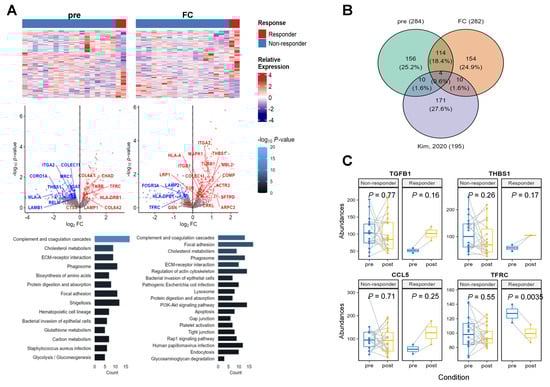 In total, 1513 proteins were identified in 20 pre- and post-treatment paired samples. To identify the biological functions of the responders, we extracted differentially-expressed proteins (DEPs) to compare the responder and non-responder groups for three cases of pre- and post-treatment, as well as the fold change (FC) of paired samples (Figure 4A). Finally, 236–284 up and downregulated DEPs were identified using Limma (p < 0.25). Next, we investigated the pathways enriched in the DEPs using gene set enrichment analysis (GSEA) (p < 0.05). In the pre-treatment condition, upregulated DEPs of the responder group were involved in the ‘ECM-receptor interaction’ and ‘phagosome’ pathways. From proteins up-expressed in post-treatment, ‘phagosome’, ‘ECM-receptor interaction’, and ‘apoptosis’ pathways consistently emerged. To verify the paired upregulation status, we performed GSEA using the difference in protein expression fold changes (log2(post/pre-treatment)) between the responder and non-responder groups. Consistently, ‘phagosome’, ‘Fc gamma R-mediated phagocytosis’, ‘ECM-receptor interaction’, and ‘TGF-beta signaling’ pathways were detected. Therefore, responders were persistently altered in pathways associated with cell–cell interactions and phagocytosis.