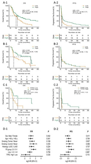 Kaplan–Meier plot for the median progression-free survival (mPFS) and median overall survival (mOS) calculated from the date of the beginning of immunotherapy. (A-1) mOS stratified by PD-L1 expression. (A-2) mPFS stratified by PD-L1 expression. (B-1) mOS stratified by TFRC expression. (B-2) mPFS stratified by TFRC expression. (C-1) mOS of patients stratified by TFRC expression in low PD-L1 patients. (C-2) mPFS of patients stratified by TFRC expression in low PD-L1 patients. (D-1) Forest plot for OS hazard ratio of patient factors and TFRC. (D-2) Forest plot for PFS hazard ratio of patient factors and TFRC. HR, hazard ration; CI, confidence interval; PS, performance status; PFS; OS; PD-L1; m; TFRC.