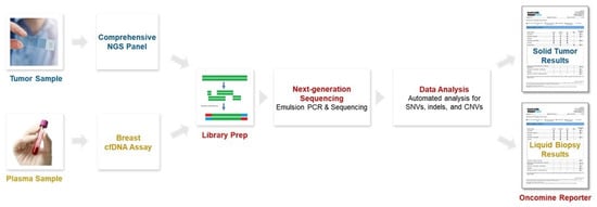 Molecular profiling was performed and potential biomarkers determined using a comprehensive next-generation sequencing (NGS) panel from fresh-frozen paraffin-embedded (FFPE) tissues and a breast-cell-free DNA (cfDNA) assay from plasma.