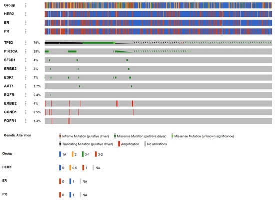 The distributions of altered genes, as well as amino acid change, functionality, and relevant clinical features are summarized in Table 1. It deserves notice that all AKT1 p.E17K mutations came from estrogen receptor (ER)-positive/human epidermal growth factor receptor II (HER2)-negative breast cancers, and most were diagnosed with late-stage disease (Groups 3-1 and 3-2, n = 7). All CCND1-amplified cases were clinically ER+ and were late-stage (Group 3-2, n = 9), and all EGFR p.L861Q samples were late-stage (Group 3-2, n = 7) as well as FGFR1 amplifications (Group 3-2, n = 7). All ERBB2-amplified breast cancers were HER2-positive (over-expression) clinically, with most being ER- and progesterone receptor (PR)-negative and were diagnosed evenly with early- (Group 1 and Group 2A, n = 9) and late-stage disease (n = 7). On the other hand, most ERBB3 mutations occurred in breast cancers without HER2 over-expression. ESR1 mutations were exclusively detected in late-stage breast cancers (Group 3-1 and Group 3-2, n = 38), and roughly two-thirds were ER/PR-positive. Hotspots for PIK3CA mutations included p.E542K, p.E545K, and p.H1047L and were distributed evenly between early and late stages, with almost three-fourths being ER-positive. SF3B1 p.K700E mutations were prone to occurring in ER+/PR+/HER2- and early-stage breast cancers. Finally, TP53 was the most common mutant gene in the current study and comprised missense, truncating, and inframe mutations.