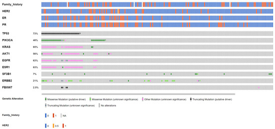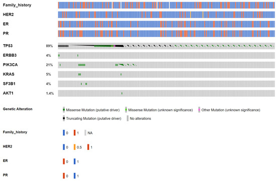 The most prevalent mutations with both platforms combined were TP53 (68.3%) and KRAS (53.5%), both well-known cancer driver genes. Although both are currently not targetable for breast cancer, TP53 is a gene very commonly mutated in both clonal hematopoiesis and tumors and is rarely representative of the germline Li–Fraumeni syndrome; consequently, routine germline testing may not be necessary for most patients with somatic TP53 mutations [20]. KRAS mutations are observed across a variety of cancer entities, while the recent advent of the KRAS (G12C) inhibitor render KRAS-mutant tumors druggable [21,22]. For contemporary breast cancer actionability, PIK3CA mutation is a biomarker for the FDA-approved PI3Kα inhibitor alpelisib, AKT1 mutation is indicated for agents such as capivasertib (AZD5363) and ipatasertib, and ERBB2 mutation for tyrosine kinase inhibitor neratinib [23,24,25,26,27]. Our study did ascertain the value of targeted sequencing for breast cancer, even at an earlier disease setting.