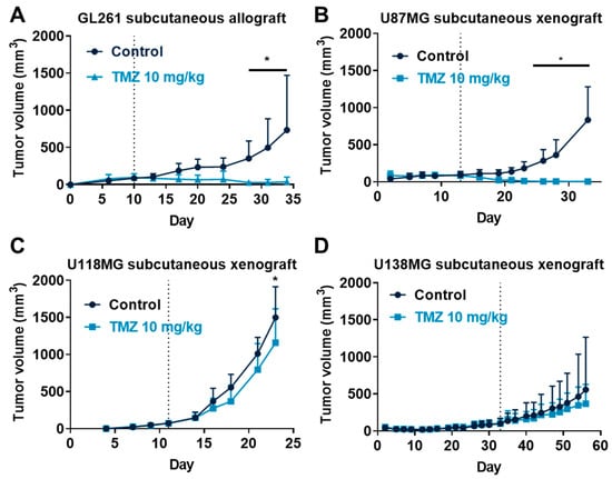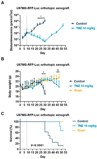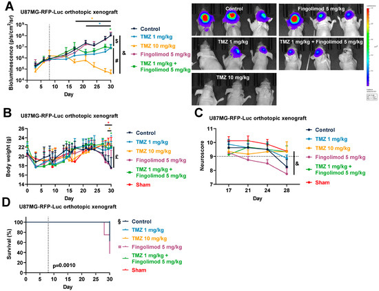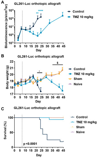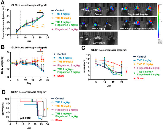 APA StyleDavy, M., Genest, L., Legrand, C., Pelouin, O., Froget, G., Castagné, V., & Rupp, T. (2023). Evaluation of Temozolomide and Fingolimod Treatments in Glioblastoma Preclinical Models. Cancers, 15(18), 4478. https://doi.org/10.3390/cancers15184478