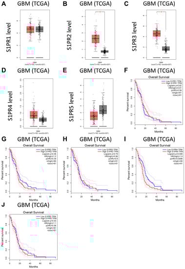 - Mahajan-Thakur, S.; Bien-Möller, S.; Marx, S.; Schroeder, H.; Rauch, B.H. Sphingosine 1-Phosphate (S1P) Signaling in Glioblastoma Multiforme—A Systematic Review. Int. J. Mol. Sci. 2017, 18, 2448. [Google Scholar] [CrossRef]