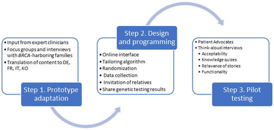 The adaptation of the Family Gene Toolkit prototype followed a three-step process (Figure 1). In step 1, we updated and adapted the prototype based on newer evidence regarding cancer risks associated with BRCA1/BRCA2 pathogenic variants and feedback from expert clinicians, researchers, and individuals from BRCA1/BRAC2-harboring families. In step 2, we designed and programmed the functions of the web application that will host the Family Gene Toolkit. In step 3, we tested the acceptability and usability of the new Family Gene Toolkit. The study protocol has been approved by appropriate Ethics Committees (BASEC 2016-02052 and SEVIRB 2020-0833-006) and is publicly available (NCT04214210; KCT0005643).