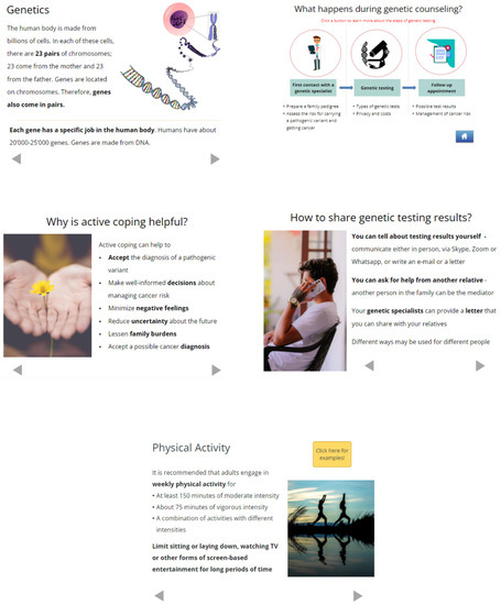 The adapted Family Gene Toolkit included the original four modules and a newly developed fifth module addressing cancer risk management. The modules and the interface were supplemented with multiple interaction options to enhance user engagement, i.e., quizzes and assessments, illustrative stories, and resources to connect with psychologists, family therapists, nutritionists, and specialists for smoking cessation. Pictures were carefully selected for each country to enhance the displayed messages and increase relatedness based on age, sex, and race (Figure 2 and Supplementary Materials). The content was adapted as follows: