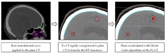 The intrafractional rotations and translations were applied to the planning CT (Fx-CT) using the MIM software, version 7.1.4 (MIM Software Inc., Cleveland, OH, USA). Fx-CT was rigidly co-registered with the planning CT to transfer the original patient RT structures. The accuracy of the registration was qualitatively analyzed by using anatomical landmarks as reference points. Redundantly, an expert radiation oncologist validated the transferred structures by comparing them with the planning MRI. The resulting 3D GTV barycenter shift was calculated by taking the difference between the barycenter of each lesion in the original and Fx-CT images. The original patient-specific treatment plan was recalculated on the corresponding Fx-CT with Monaco Monte Carlo TPS, using the same algorithm and calculation properties. For fSRS treatments, the three different recalculated plans from each fraction were summed on the simulation CT to estimate the total cumulative plan. Thus, plans involving translations and rotations (Fx-plans) allowed the simulation of doses that were actually delivered to the patients. Figure 2 illustrates the dose recalculation workflow in a schematic representation.