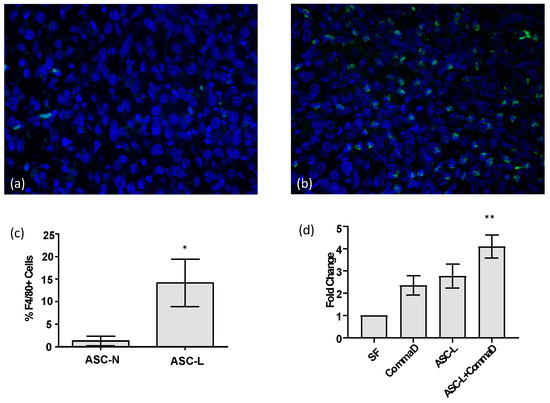 ASC-Ls recruit macrophages into the tumor microenvironment. (a) Representative immunofluorescence image of breast cancer tissue isolated from mice co-injected with 4T1-12B cells and ASC-Ns stained with F4/80+ (green) and DAPI (blue). (b) Representative immunofluorescence image of breast cancer tissue from mice co-injected with 4T1-12B cells and ASC-Ls stained with F4/80+ (green) and DAPI (blue). (c) Quantification of macrophages present in tumors co-injected with 4T1-12B cells and ASC-Ns or 4T1-12B cells co-injected with ASC-Ls (n = 6 tumors/group). Mann–Whitney U test; * p = 0.0025 (d) Quantification of migration assay measuring migration of RAW 264.7 macrophages towards serum-free media (SF) or conditioned media. Repeated measures ANOVA with Dunn’s multiple comparison test; SF versus ASC-L + CommaD ** p = 0.03.