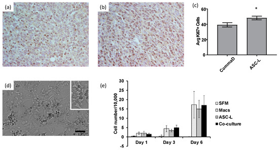 ASC-Ls and macrophages increase proliferation of breast cancer cells. (a) Representative immunohistochemistry image of breast cancer tissue isolated from mice injected with CommaD cells stained with Ki67. (b) Representative immunohistochemistry image of breast cancer tissue isolated from mice co-injected with CommaD cells and ASC-Ls stained with Ki67. (c) Quantification of Ki67 staining measuring proliferation of CommaD cells. * p = 0.02 Mann–Whitney U Test (n = 5 tumors/group). (d) Representative image of cells grown in co-culture. Macrophages are the more rounded, darker cells while ASC-Ls are lighter and more stellate. Scale bar = 50 μm. (e) Proliferation assay using conditioned media on 4T1-12B cells (n = 4).