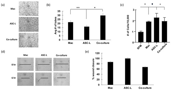 Co-culture increases angiogenic potential of HUVEC cells. (a) Representative images of tube forming assay using HUVEC cells. (b) Quantification of tube forming assay. * p = 0.04, ** p = 0.009 Student’s t-test (n = 3). (c) Proliferation assay day 3 using conditioned media on HUVEC cells. * p = 0.005, ♦ = 0.03, Δ = 0.04. One-way ANOVA with Tukey’s Multiple Comparison test. n = 3 (d) Representative images of wound healing assay using conditioned media on HUVEC cells. (e) Quantification of wound healing assay. Macrophage and co-culture wound closure relative to ASC-L, which was set to 100%. n = 3.