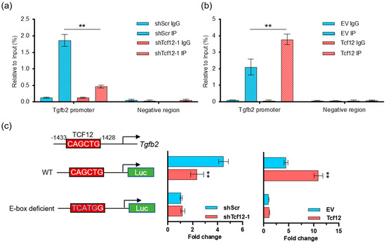 TCF12 directly binds to and activates the Tgfb2 promoter: (a) Chromatin immunoprecipitation (ChIP) coupled with qPCR analysis showing the binding of TCF12 to the Tgfb2 promoter in YUMM1.7 cells, which is decreased upon TCF12 knockdown; (b) ChIP−qPCR analysis showing the increased binding of TCF12 to the Tgfb2 promoter in YUMM1.7 cells upon TCF12 overexpression; (c) the schematic diagrams show the Tgfb2 promoter−driven luciferase reporters with either wild-type (WT) or E-box deficient sequences. Luciferase activity was measured and displayed as fold change. Statistical significance is based on comparison with the control group (shScr or EV). ** p < 0.01.