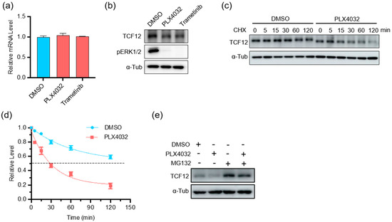 BRAF mutations represent the most prevalent oncogenic event in melanoma, resulting in constitutive activation of the BRAF-MEK-ERK MAPK pathway [31,32,33]. To test whether there is any correlation between BRAF signaling and TCF12, we treated BRAF-mutant A375 cells with the BRAF(V600E) inhibitor PLX4032 or the MEK inhibitor trametinib. We found that inhibition of the MAPK pathway did not alter the transcript of TCF12 (Figure 7a), but reduced the expression level of TCF12 protein (Figure 7b), suggesting a post-transcriptional regulation. We then measured the TCF12 protein stability in melanoma cells with or without BRAF inhibition and found that suppression of the BRAF pathway greatly reduced TCF12 protein stability (Figure 7c,d). We further found that the BRAF inhibition-facilitated TCF12 degradation was mediated by the proteosome, as the concurrent addition of the proteosome inhibitor MG132 markedly prevented the reduction of TCF12 protein by PLX4032 (Figure 7e).