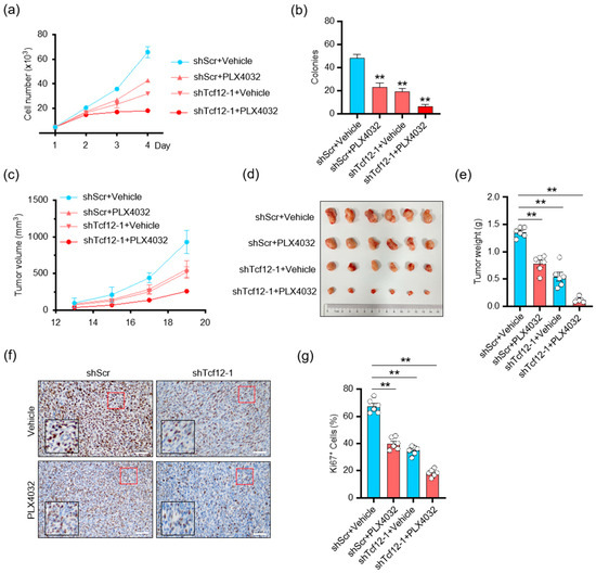 Depletion of TCF12 sensitizes melanoma to BRAF inhibition: (a,b) Cell proliferation (a) and colony formation (b) analysis of cells with TCF12 knockdown, PLX4032 treatment, or their combination; (c) tumor growth curves in mice injected cells with TCF12 knockdown and treated with PLX4032, n = 6 mice per group; (c,g) tumor growth curves (c), representative tumor image (d), tumor weights (e), representative images of Ki67 IHC (red square, 200×; black square, 400×) (f) and subsequent analysis (g) from control (shScr + vehicle), PLX4032 treatment (shScr + PLX4032), TCF12 knockdown (shTcf12-1 + vehicle), and their combination (shTcf12-1 + PLX4032) groups. Scale bar: 50 μm. Statistical significance is based on comparison with control group. ** p < 0.01.