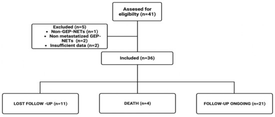 We retrospectively included patients with the following eligibility criteria: adults (age ≥ 18 years) who had advanced GEP-NETs and who were assigned to PRRT treatment (an activity of 100–200 mCi of Lu-177 DOTATATE) at the Nuclear Medicine Department of Hospital Sírio-Libanês from April 2016 to July 2022 and received at least one cycle. Exclusion criteria were primary tumor sites other than GEP, insufficient data in the medical record, or primary NECs. All the data collected was retrieved from online medical charts after ethics committee approval. A flowchart of the study design is available in Figure 1.