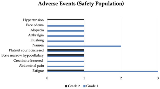 Seventeen patients did not experience PRRT toxicity, and 6 had unavailable safety data. No grade 3 or 4 toxicities were reported. Only four patients reported more than one toxicity related to PRRT over the cycles. Adverse events incidence is represented in Figure 3.